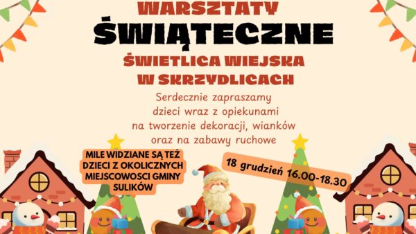 Serdecznie zapraszamy dzieci wraz z opiekunami na tworzenie dekoracji, wianków raz na zabawy ruchowe na świetlicę wiejską w Skrzydlicach w dniu 18.12.2025 od godziny 16:00.