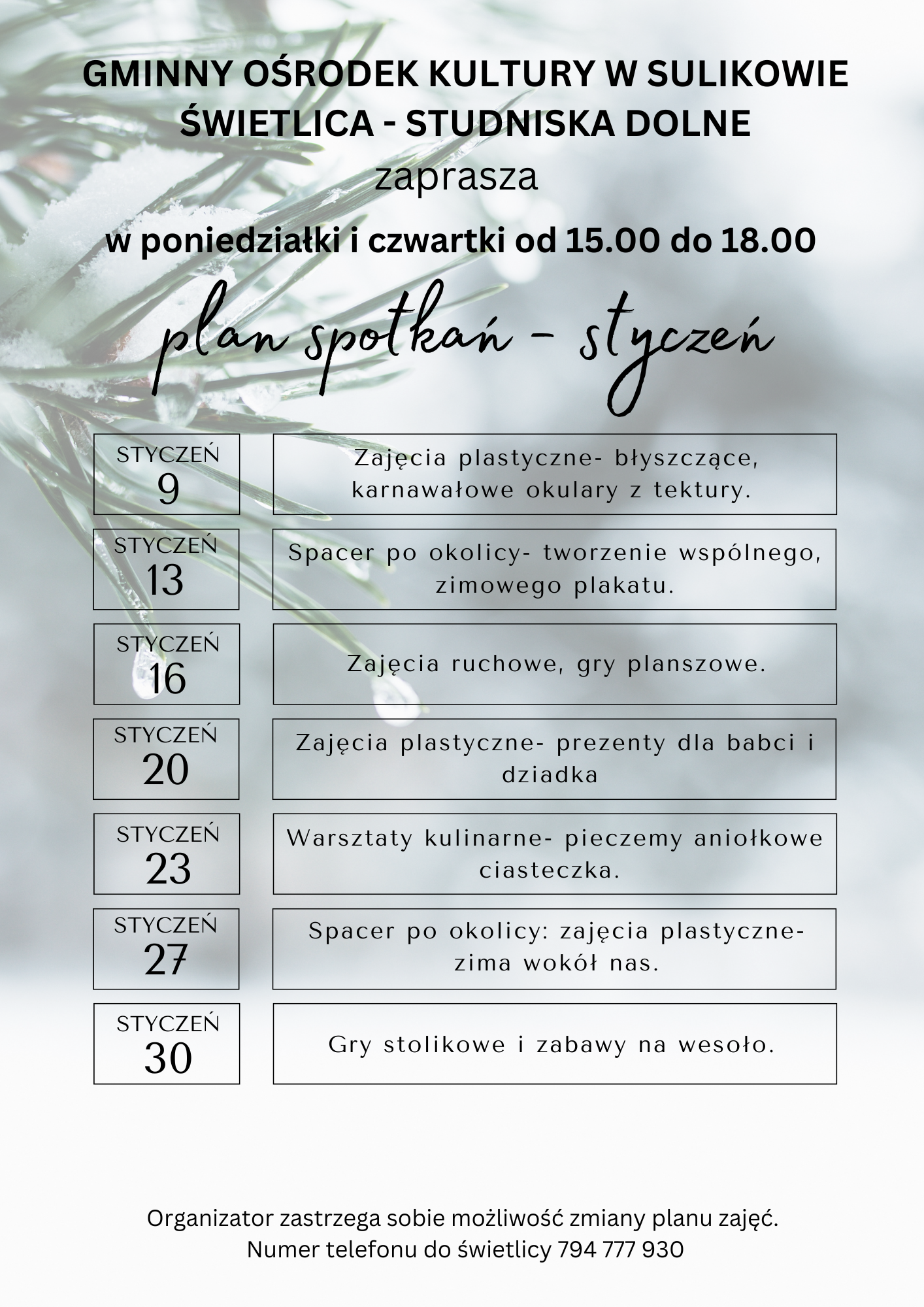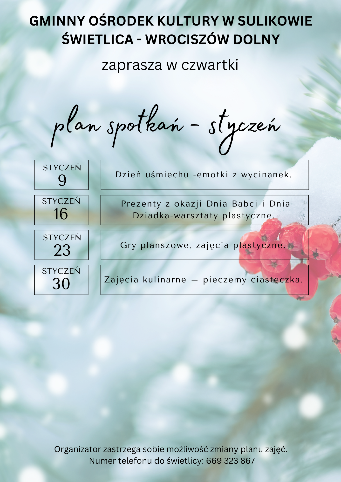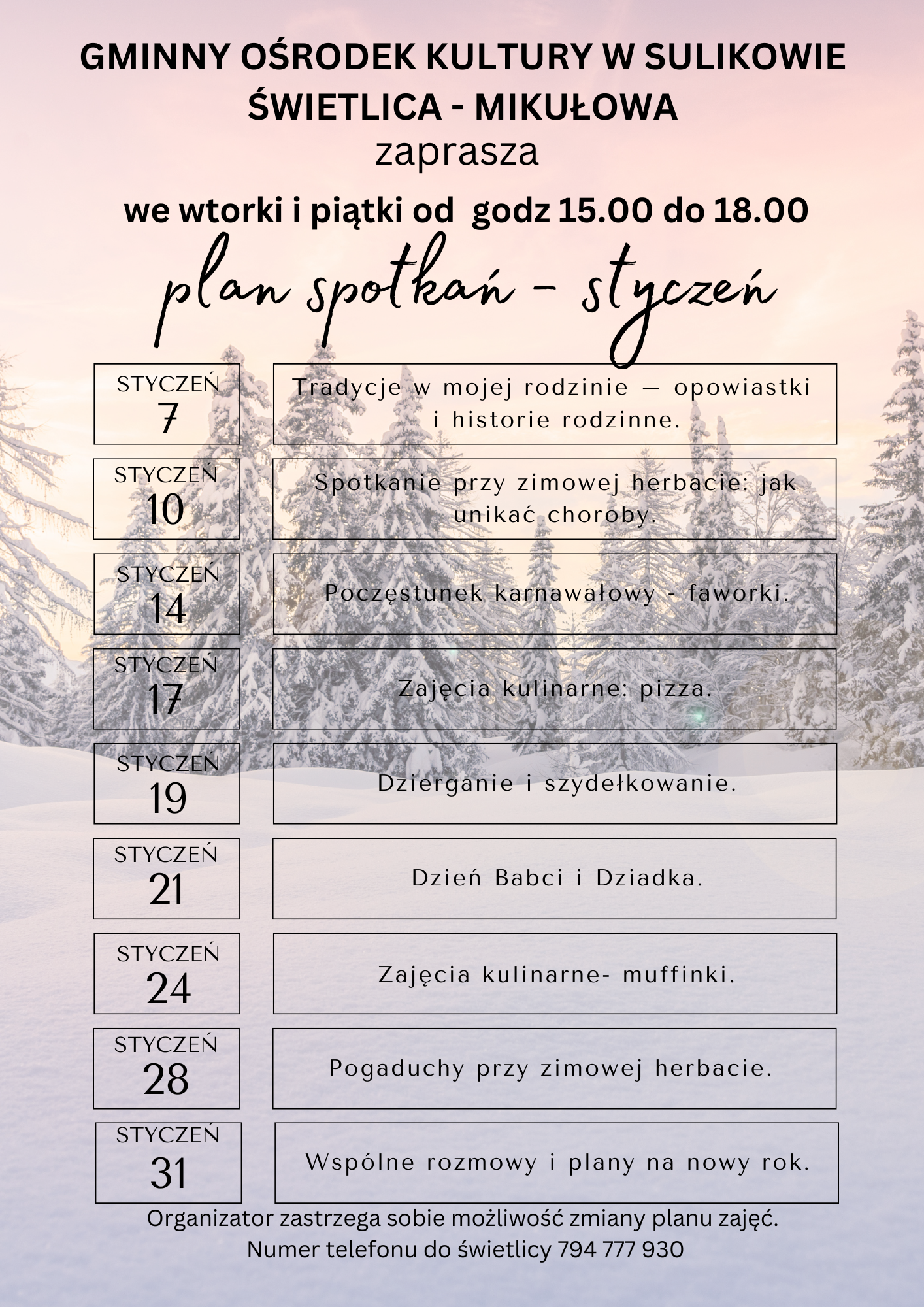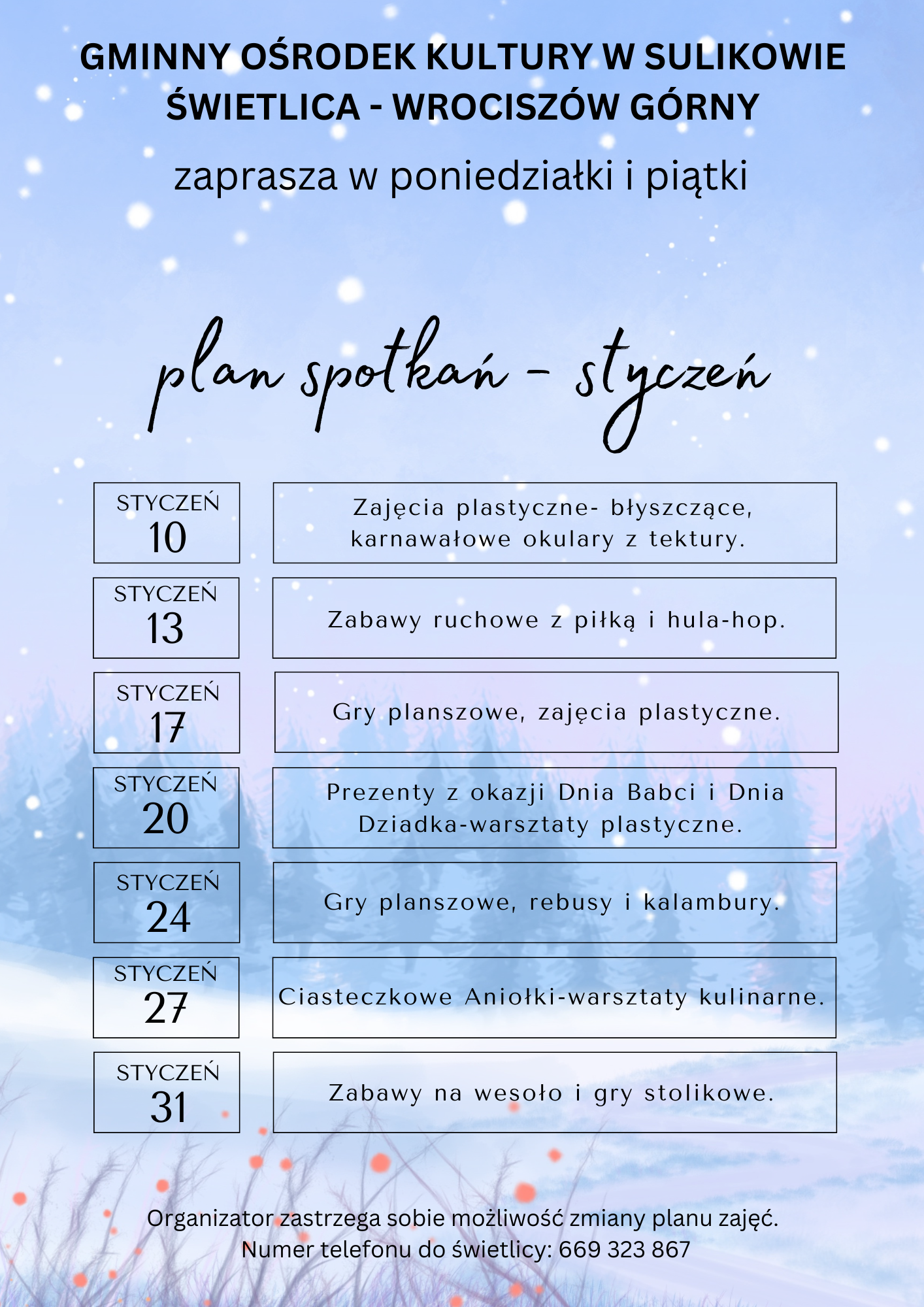 Serdecznie zapraszamy wszystkich mieszkańców – dzieci, młodzież i dorosłych – do udziału w styczniowych zajęciach. To czas na dobrą zabawę, naukę i integrację. Szczegóły w rozkładzie poniżej.