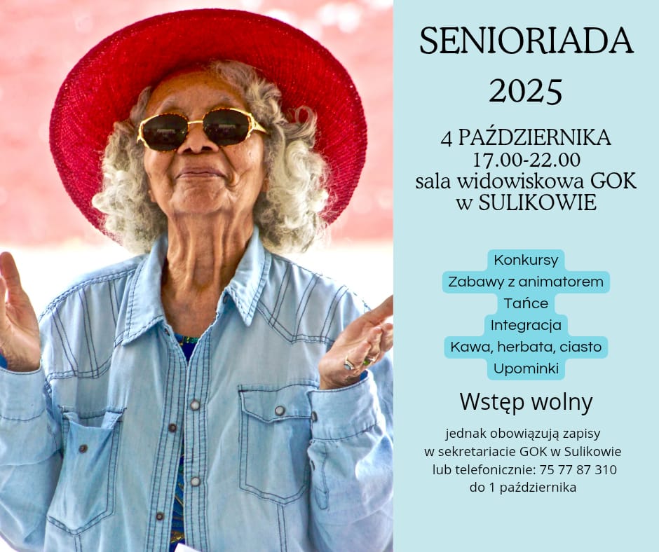 Serdecznie zapraszamy wszystkich seniorów na Senioriadę 2025, która odbędzie się 4 października w godz. 17.00–22.00 w sali widowiskowej GOK w Sulikowie.