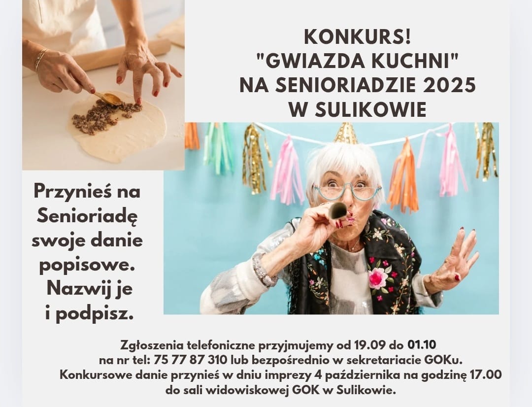 Dodatkowo zapraszamy do udziału w konkursie kulinarnym „Gwiazda Kuchni” – przynieś swoje popisowe danie, nazwij je i podpisz. Zgłoszenia przyjmujemy do 1 października w sekretariacie GOK lub pod numerem tel. 75 77 87 310.