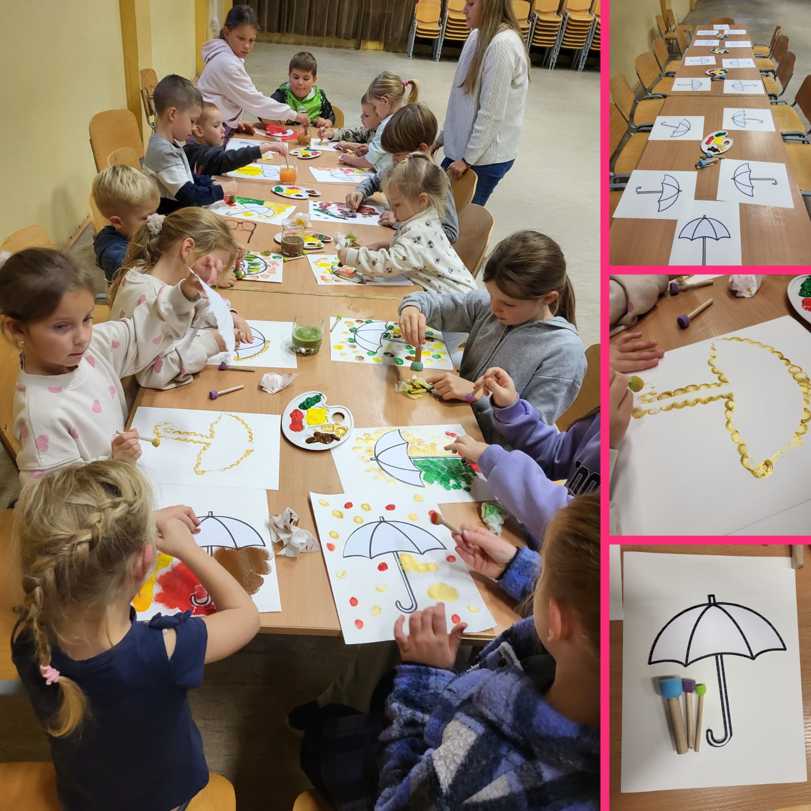Najpierw stworzyliśmy piękne stemplowane parasolki, potem przyszła pora na ruchową zabawę „Wiewióreczki” 🐿️.