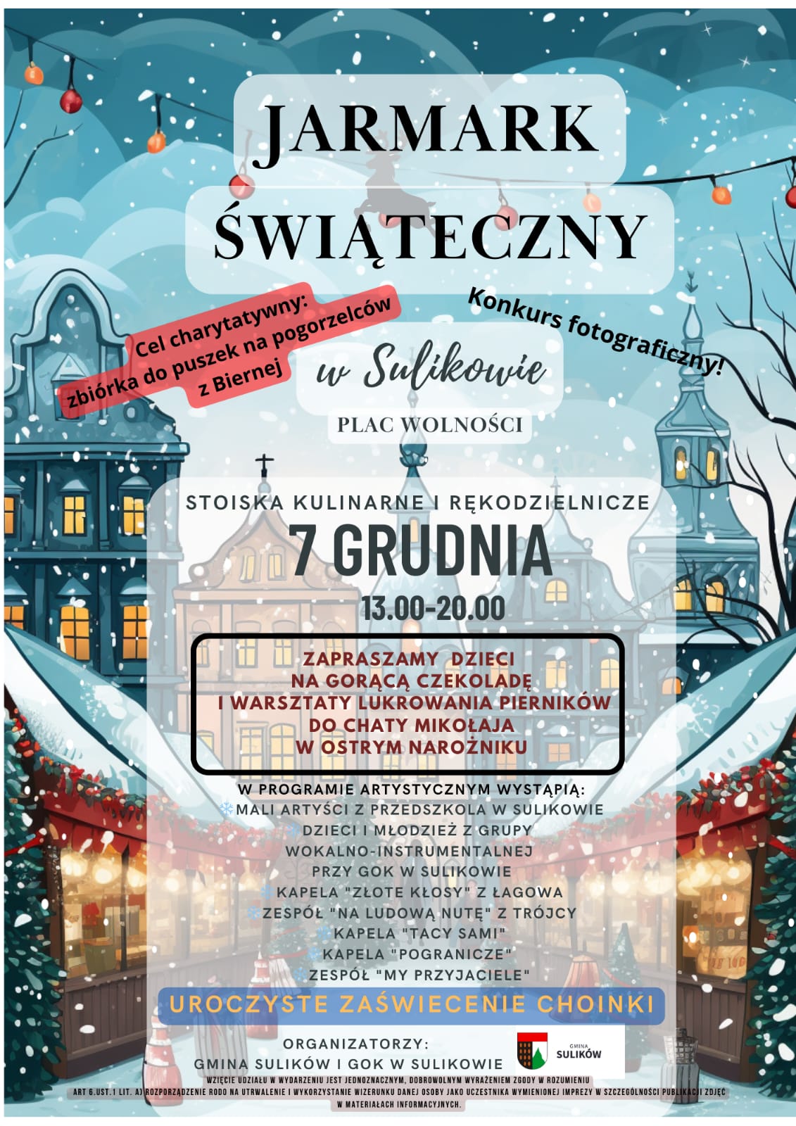 7 grudnia Sulików zamieni się w prawdziwie świąteczną krainę! Od godziny 13:00 do 20:00 na Placu Wolności odbędzie się Jarmark Świąteczny, podczas którego mieszkańcy i goście będą mogli skorzystać z bogatej oferty stoisk kulinarnych i rękodzielniczych. Szczegóły na plakacie.