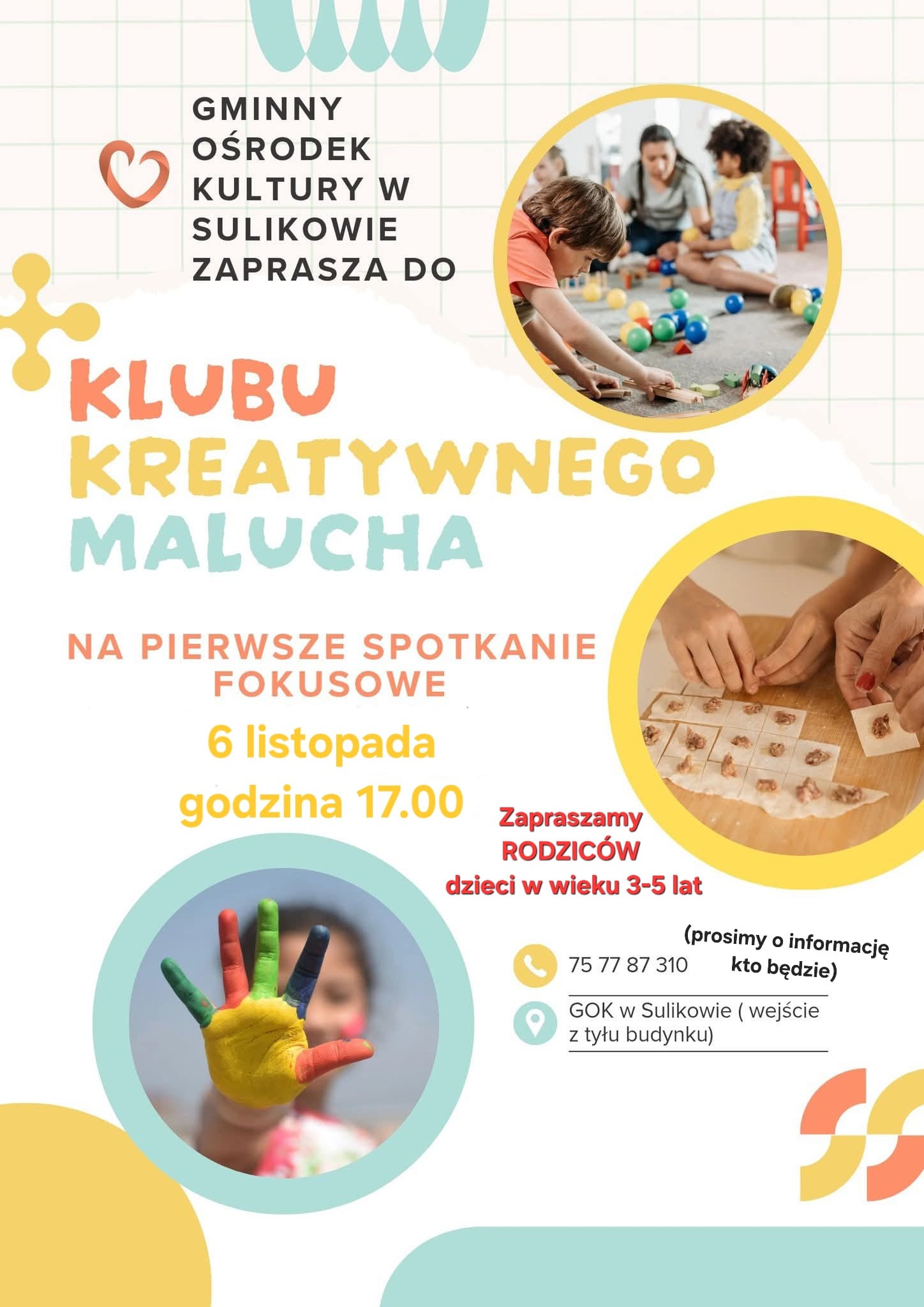 Klub Kreatywnego Malucha Zapraszamy na pierwsze fokusowe spotkanie Klubu Kreatywnego Malucha, które odbędzie się 6 listopada o godz. 17:00. Szczegóły na plakacie poniżej.