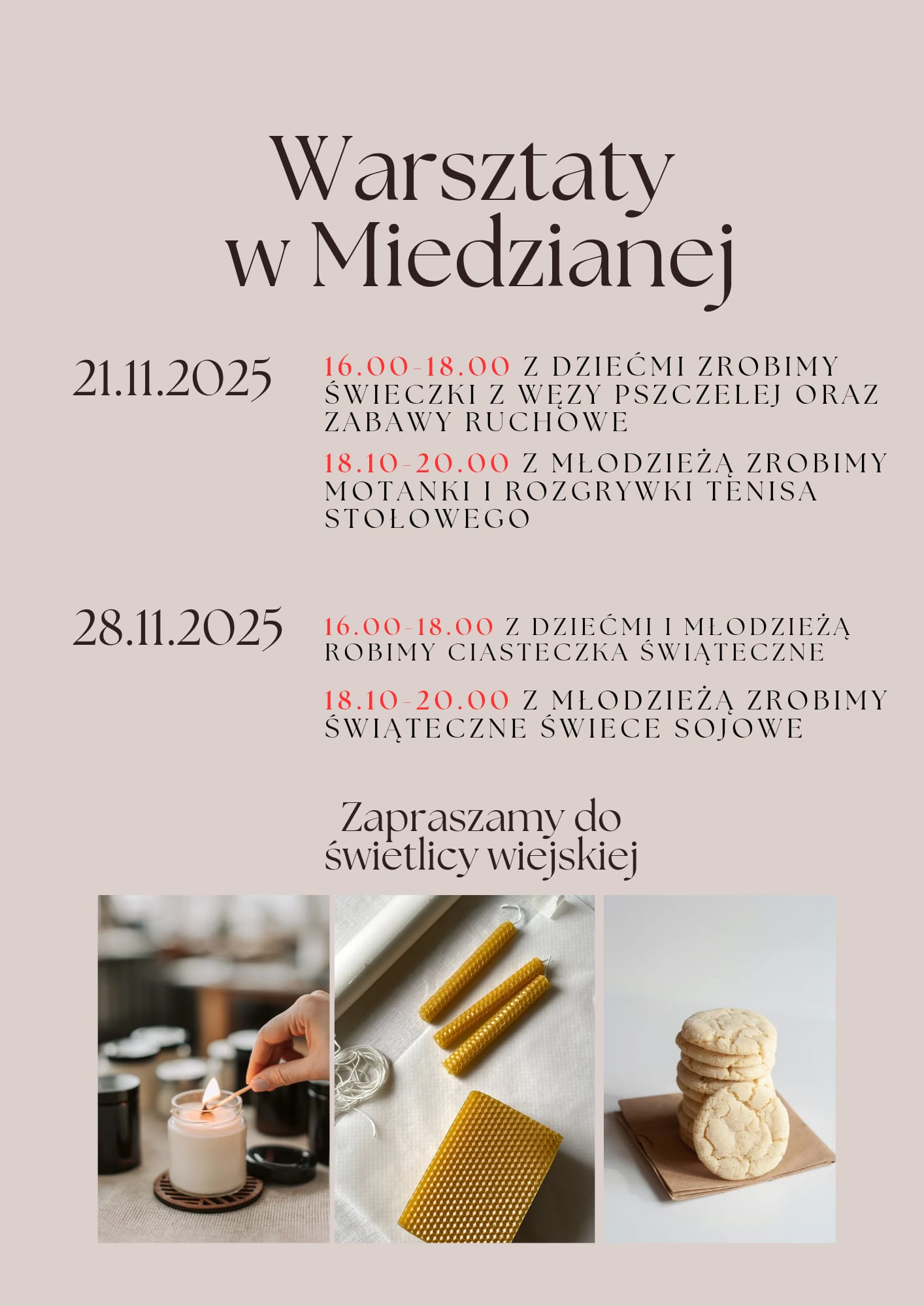 Warsztaty w Miedzianej Serdecznie zapraszamy dzieci i młodzież na warsztaty do świetlicy wiejskiej w Miedzianej w dniach 21.11 oraz 28.11. Szczegóły na plakacie.
