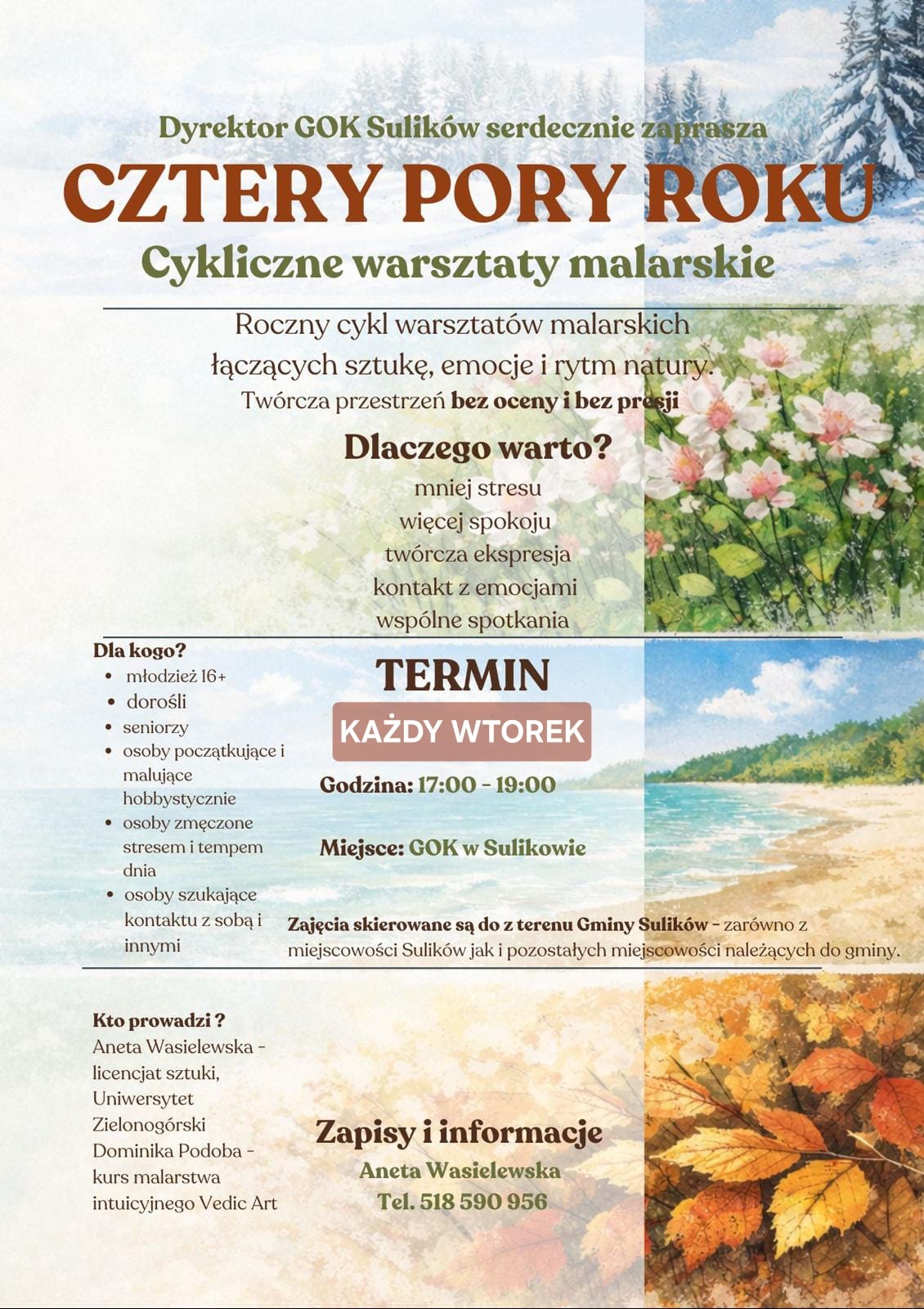 Cztery Pory Roku Gminny Ośrodek Kultury w Sulikowie zaprasza na cykliczne warsztaty malarskie Cztery Pory Roku łączących sztukę, emocje i rytm natury. Szczegóły na plakacie.