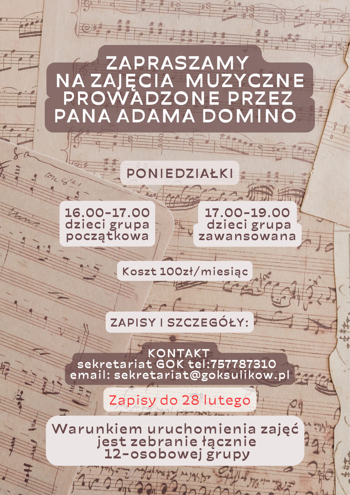 Zajęcia muzyczne w GOK Gminny Ośrodek Kultury w Sulikowie zaprasza na zajęcia muzyczne prowadzone przez pana Adama Domino. Szczegóły na plakacie poniżej.