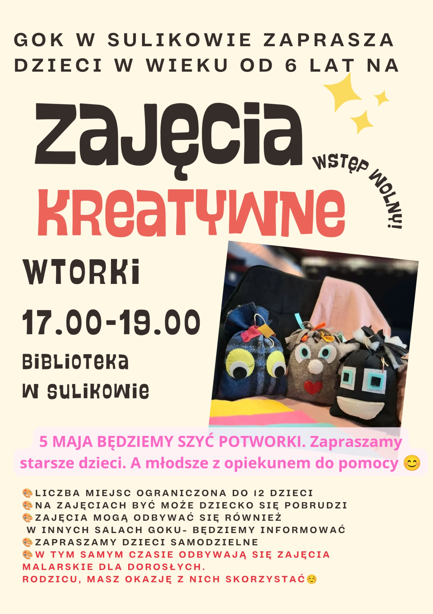 Gminny Ośrodek Kultury w Sulikowie zaprasza dzieci od 6 roku życia na bezpłatne zajęcia kreatywne.