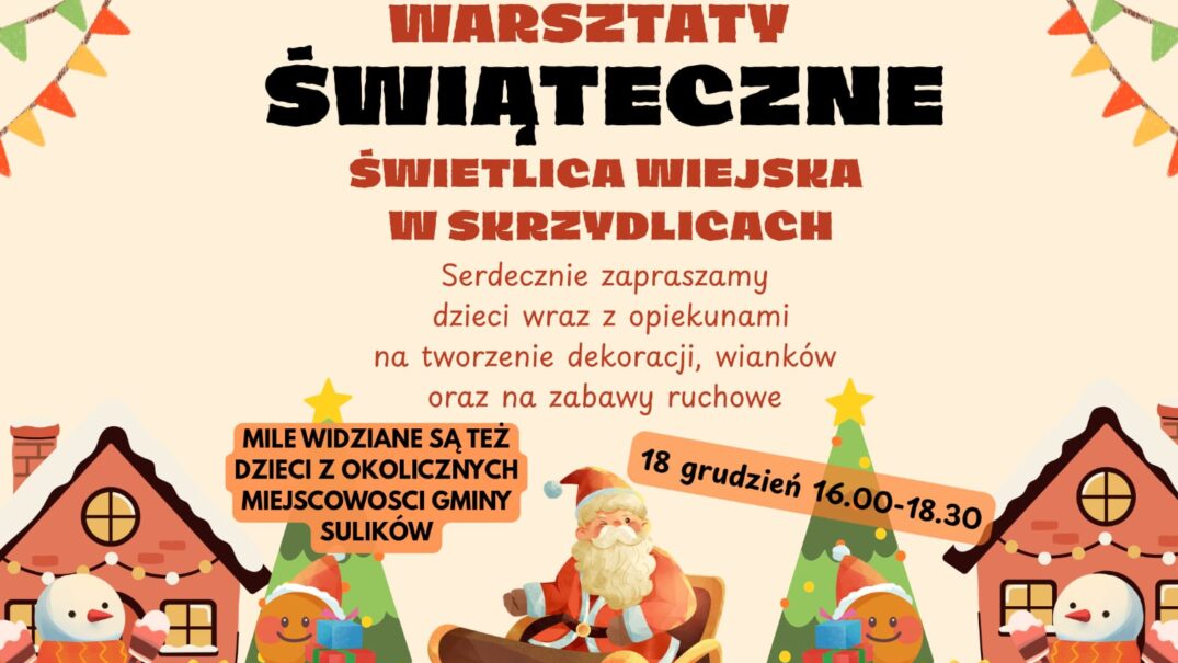 Czytaj więcej...Serdecznie zapraszamy dzieci wraz z opiekunami na tworzenie dekoracji, wianków raz na zabawy ruchowe na świetlicę wiejską w Skrzydlicach w dniu 18.12.2025 od godziny 16:00.
